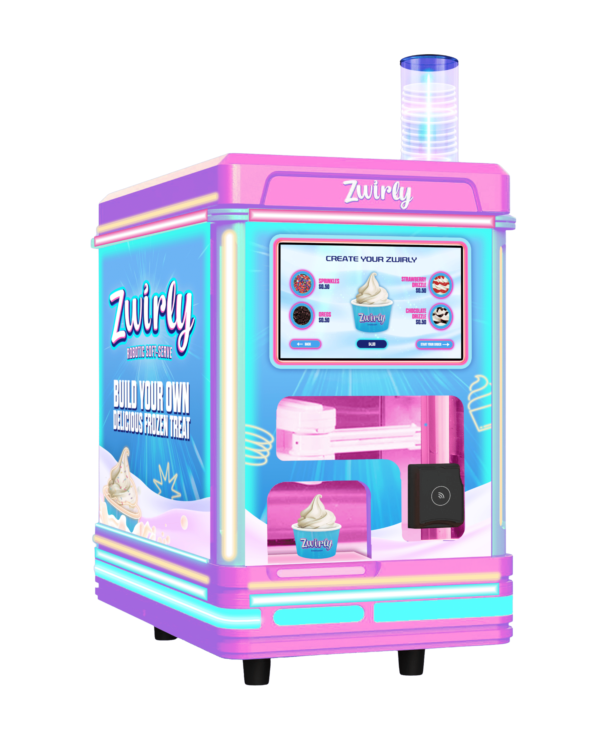 The machine dispenses premium, creamy Zwirly soft-serve ice cream made from high-quality ingredients. Non GMO and Gluten Free. There are options for classic flavors like vanilla and chocolate, as well as customizable selections based on your business needs. In addition two toppings and two syrups can be added to each treat.